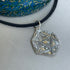 Sterling Silver on a long black leather cord, can be easily tied at any length.