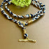 28 inches long, can be worn as a Y lariat or doubled as a choker. Made out of good vibrational 14kt gold plated brass and string (cotton on all but the rainbow which is polyester).
